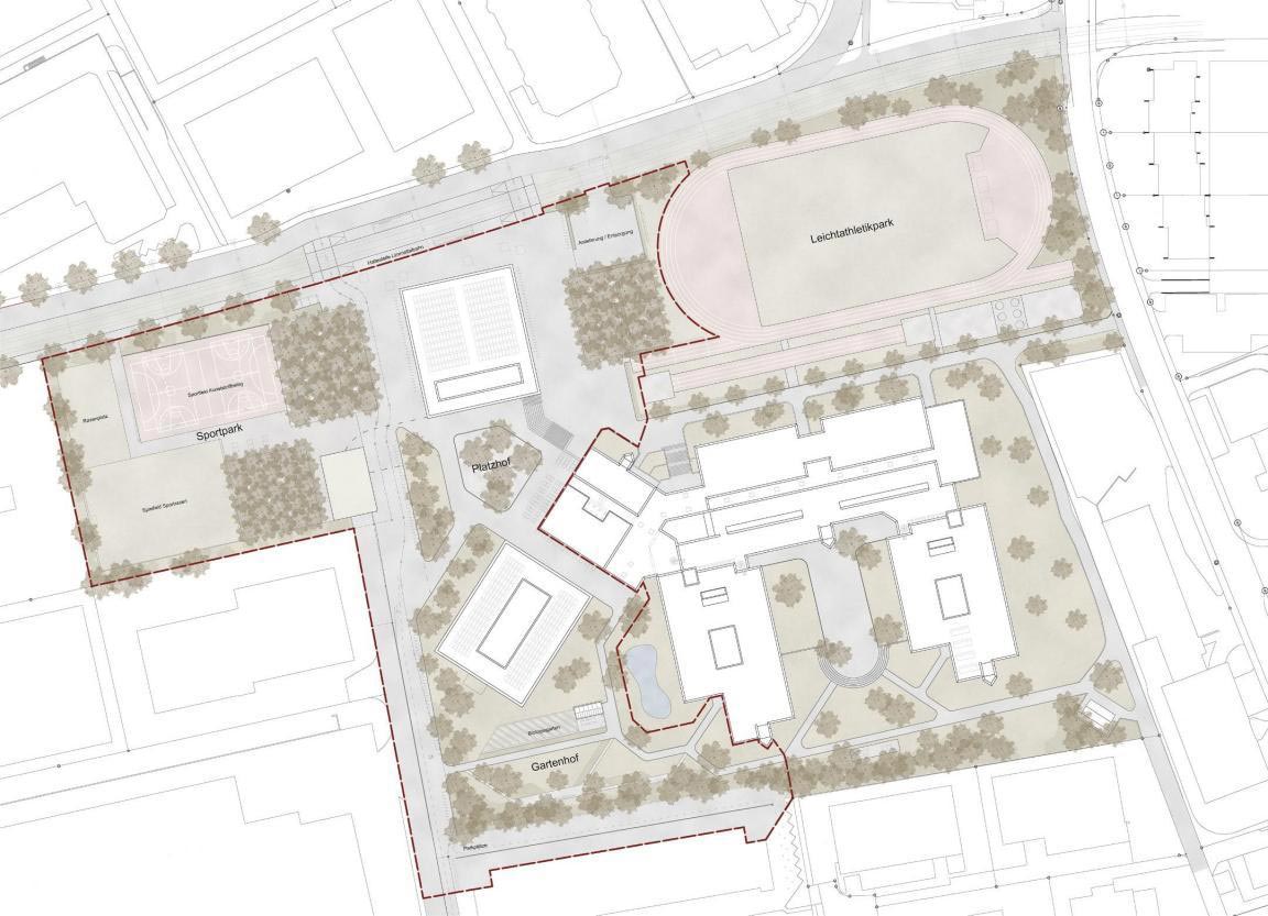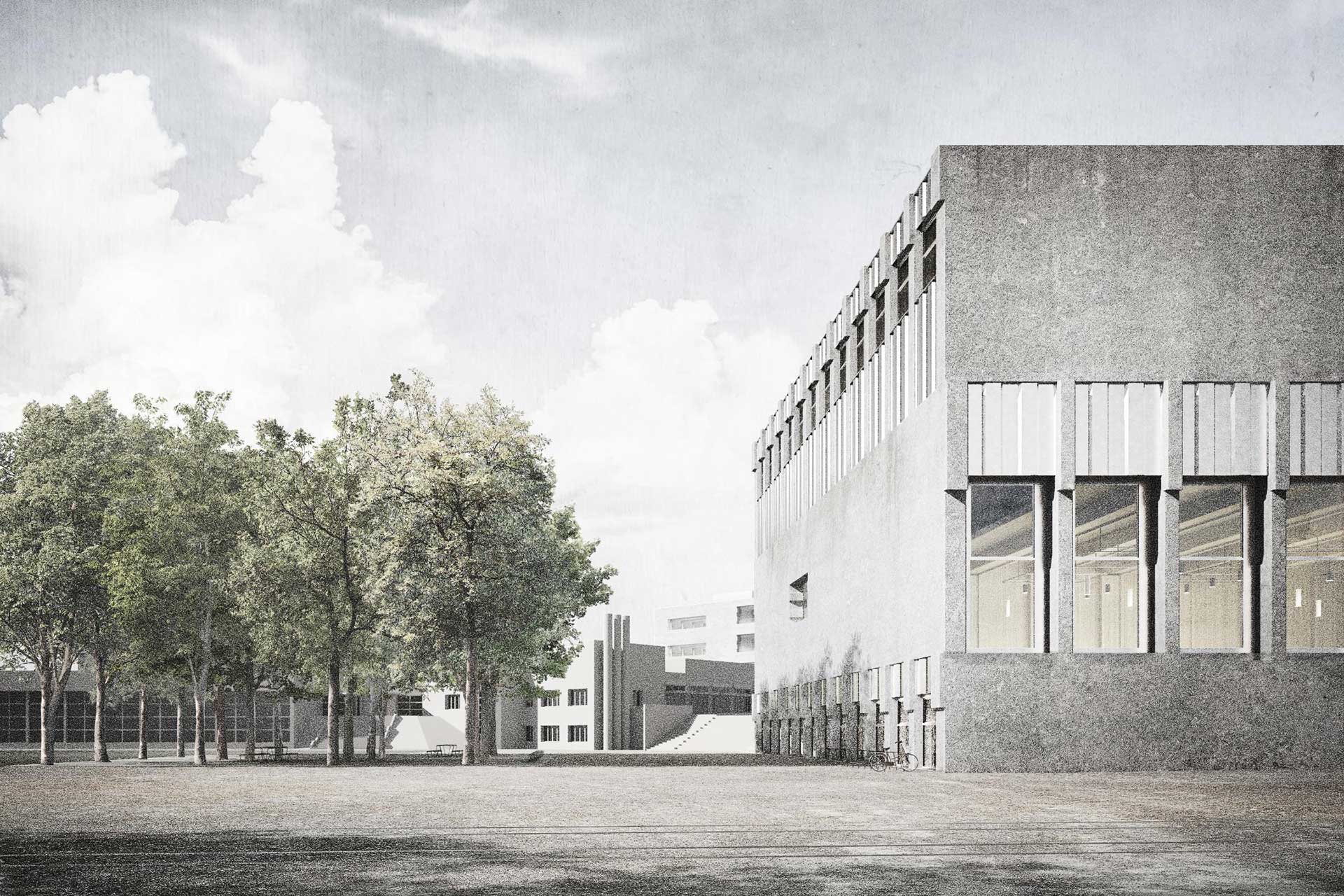 Den städtebaulichen Charakter der Campus-Anlage bilden funktionale Nutzungseinheiten, die sich mit dem grosszügigen Grünraum verzahnen. Diese werden mit den beiden Erweiterungsneubauten im Westen mit dem Trakt E (Naturwissenschaften) und im Norden mit dem Trakt F (zwei Doppelsporthallen und Aula) gekonnt fortgeführt. Die neuen Trakte sind als strukturelle Bauten in Anlehnung an den Bestand konzipiert. Die Fassade spiegelt den Rohbau und die aussteifenden Stirnwände sind aus Sichtbeton, die verglasten Fronten werden mit Trapezblech in Anlehnung an die bestehende Welleternit-Fassade verkleidet.