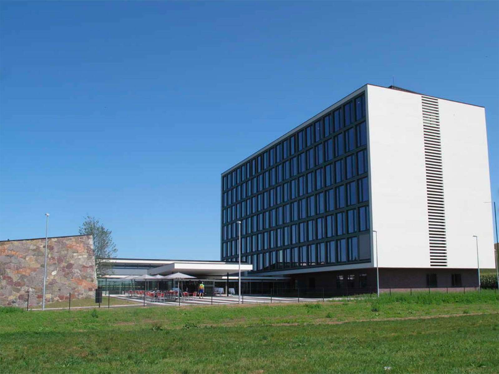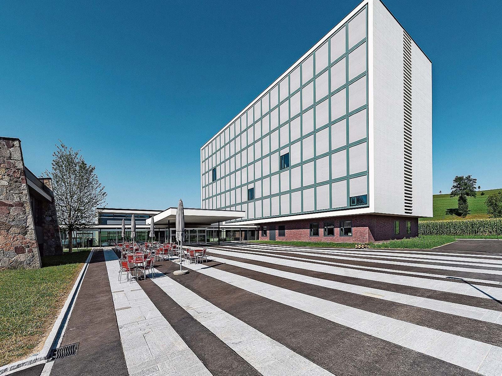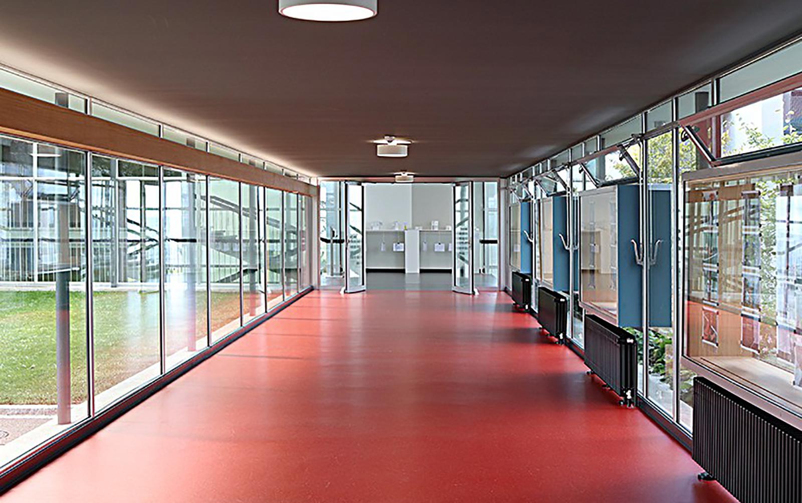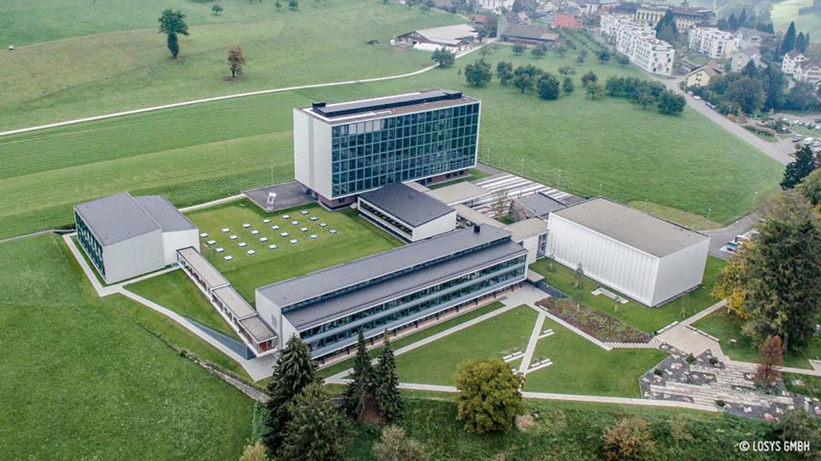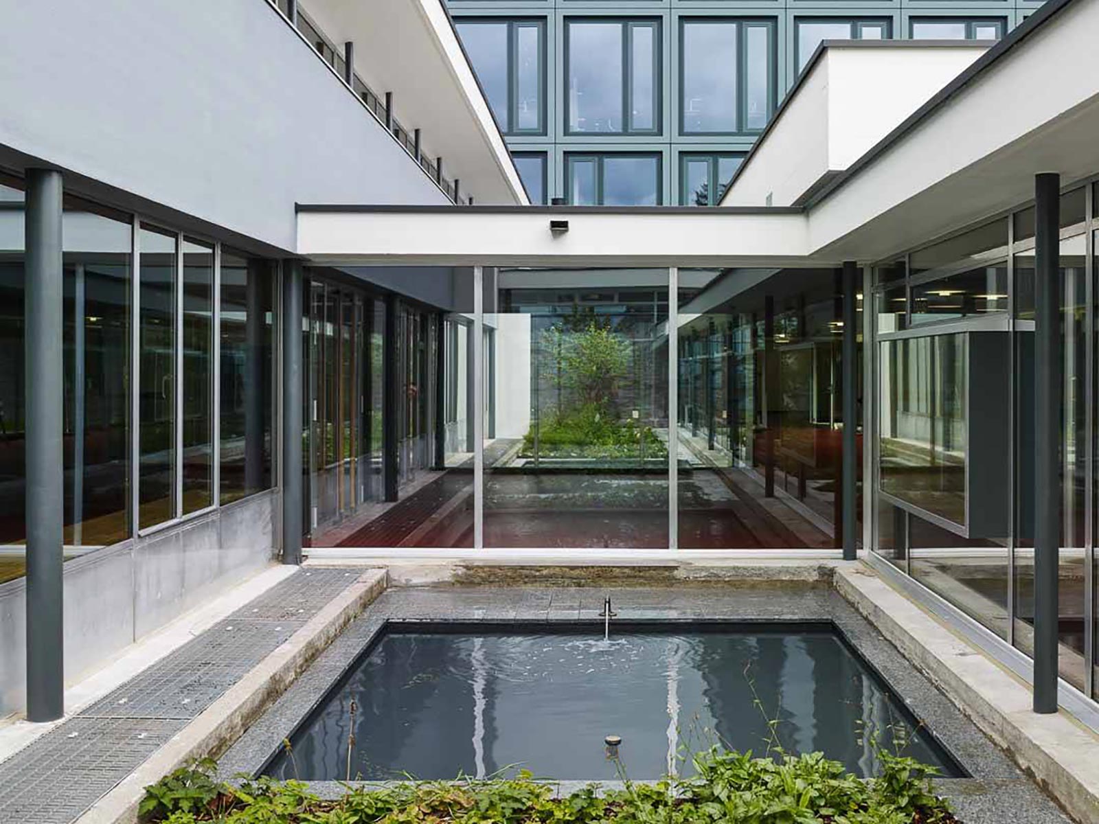 Der siebengeschossige Trakt mit Klassen- und Naturwissenschaftszimmern in den Obergeschossen sowie der Schulverwaltung im Erdgeschoss übernimmt weitgehend die Dimensionen des früheren Gebäude. Die neue Einzelsporthalle orientiert sich ebenfalls am ursprünglichen Volumen der alten Sporthalle. Die zusätzlich erforderliche Zweifachsporthalle ist unterirdisch angeordnet und zeichnet sich nach aussen hin lediglich durch ein Feld von regelmässig gesetzten Oberlichtern ab, so dass der Innenhof erhalten bleibt. Die bestehenden Bauten wurden sorgfältig saniert und nach denkmalpflegerischen Kriterien für den Schulbetrieb angepasst. Im ehemaligen Schulhaustrakt sind die musischen Fächer und der Lehrerbereich untergebracht. Die Kapelle wurde zur Mediathek umfunktioniert, währenddessen die darunter liegende Aula ebenso beibehalten wurde wie die direkt hinter dem Hauptzugang liegende Mensa.